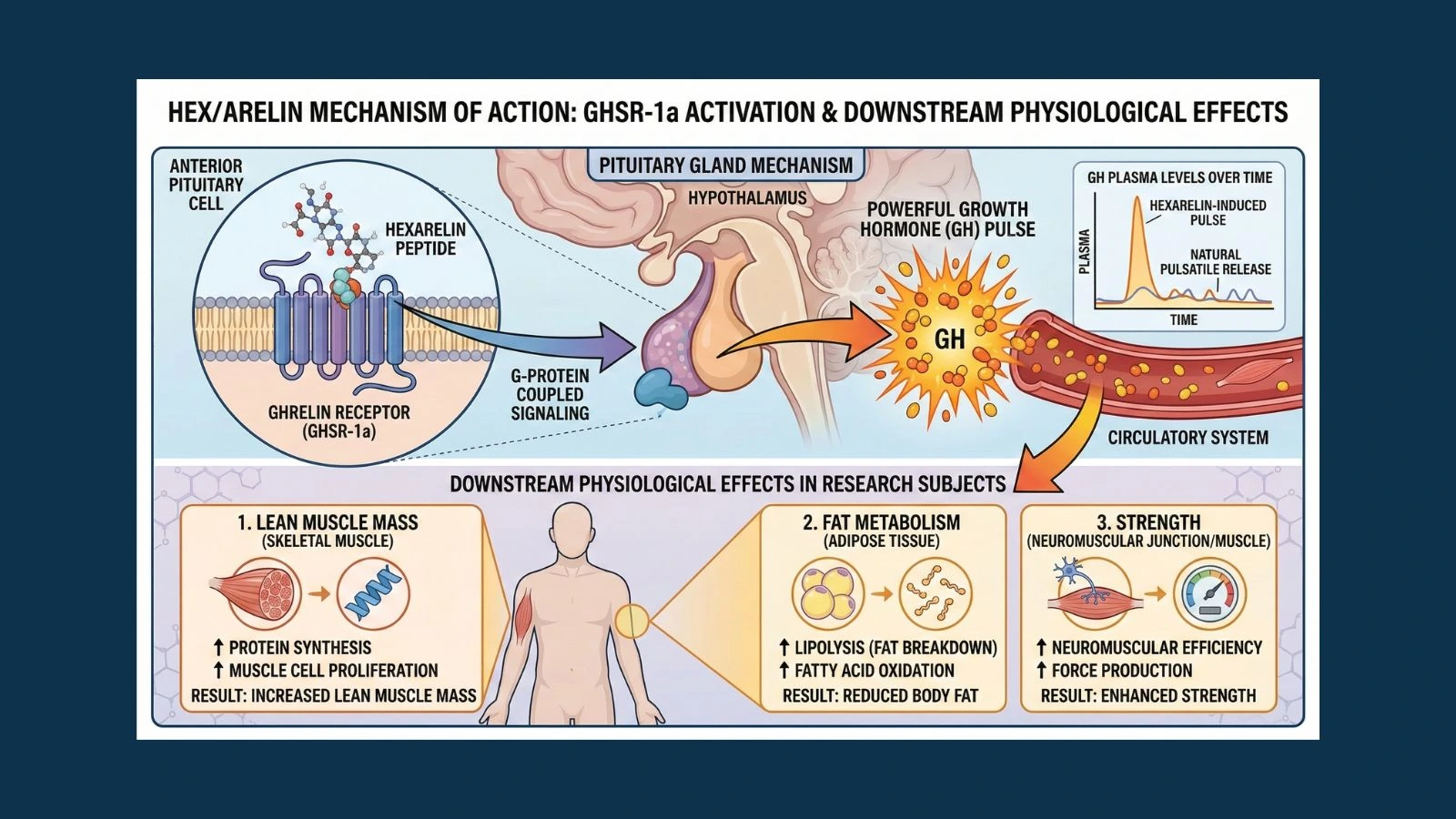 After administration, hexarelin enters circulation and crosses into the brain. It binds with high affinity to GHSR-1a receptors in two key areas: the arcuate nucleus of the hypothalamus and the somatotroph cells of the anterior pituitary.
