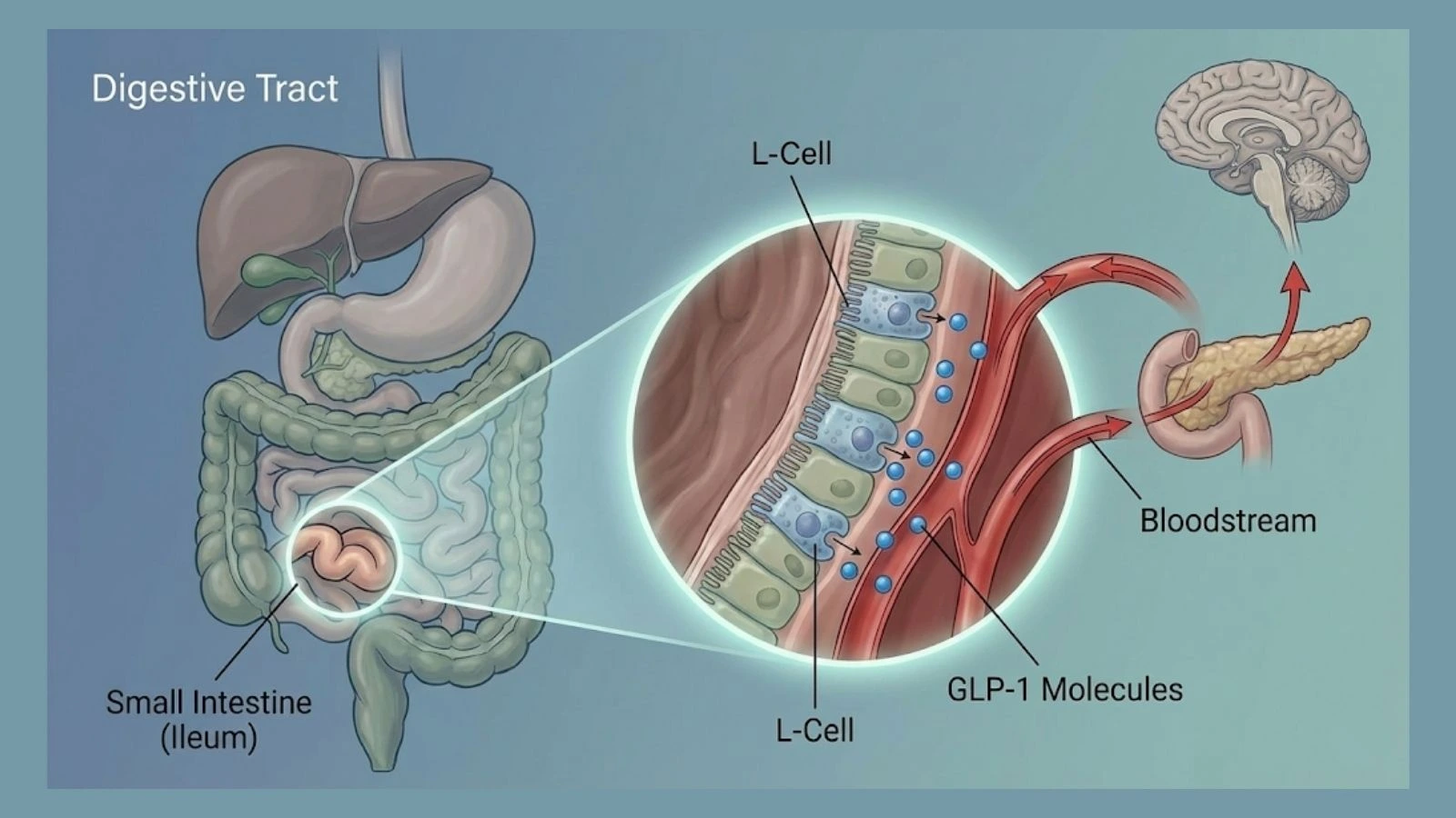 Imagine you are eating a large meal. As the food reaches the lower part of your small intestine (the ileum), your body realizes it has enough energy to process. The L-cells release GLP-1, which travels to three main destinations to slow everything down.